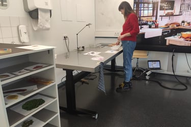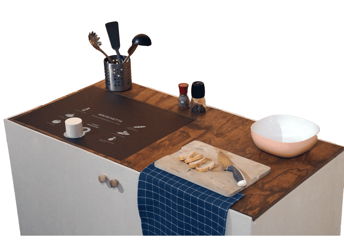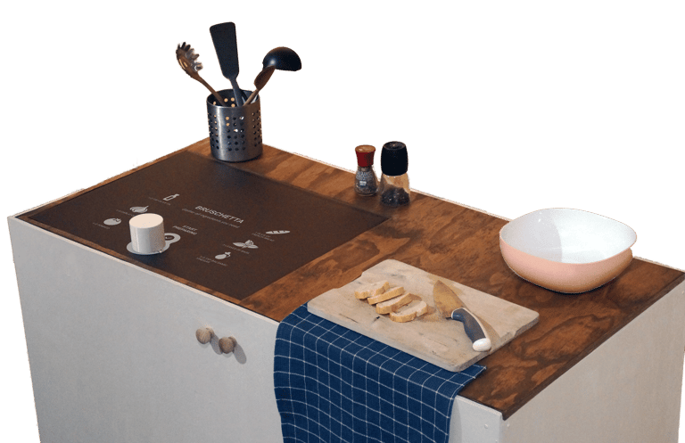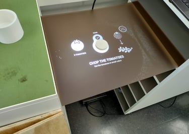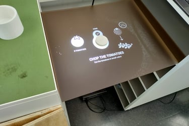 The interface, displayed with a beamer onto an Acrylic sheet, is seamlessly integrating to the kitchen counter, making it easy to follow instructions.